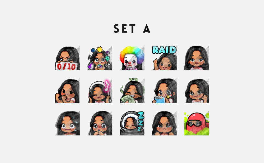 Kindly click the hyperlink of the set or chibi style below or select the color variation you want to purchase. You can also check the cover photos to see what the other emote sets and color variations look like. Thank you!