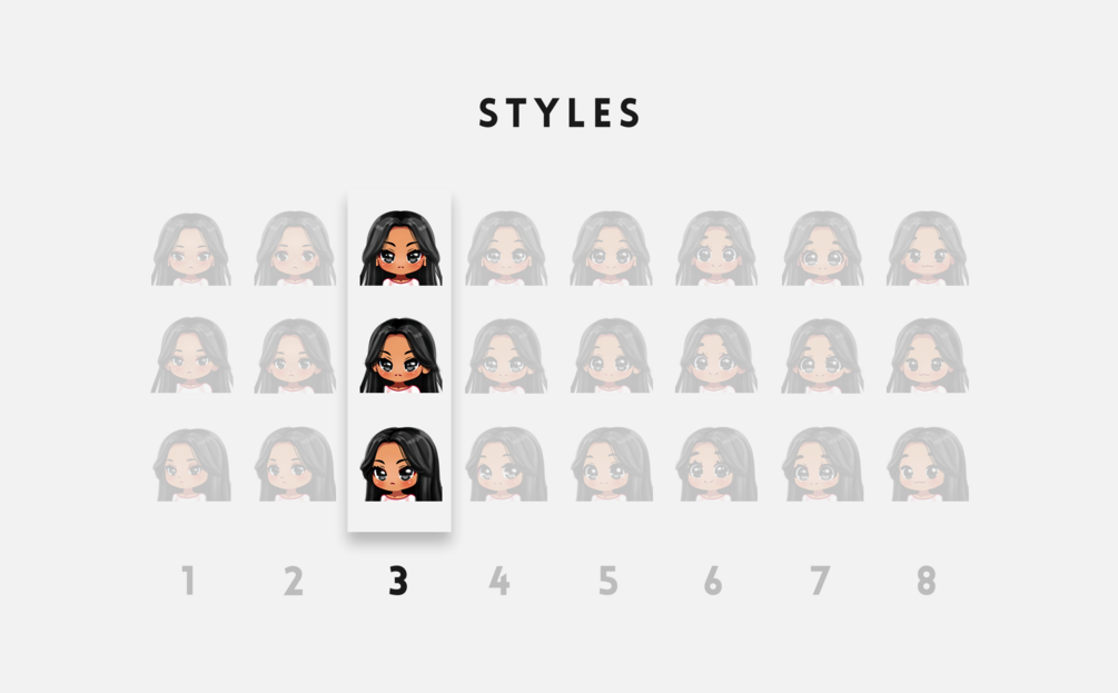 You can find all the sets and color variations we made for this chibi style. You can also browse our other chibi styles which are 8 in total. We have 4 sets of premade designs (each set has 15 emotes) and 22 color variations for each chibi style.