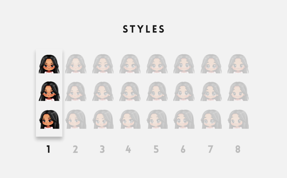 You can find all the sets and color variations we made for this chibi style. You can also browse our other chibi styles which are 8 in total. We have 4 sets of premade designs (each set has 15 emotes) and 22 color variations for each chibi style.