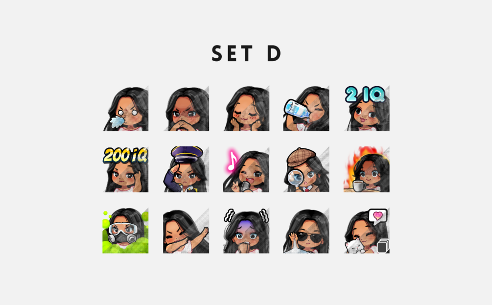Kindly click the hyperlink of the set or chibi style below or select the color variation you want to purchase. You can also check the cover photos to see what the other emote sets and color variations look like. Thank you!